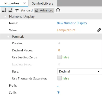 - Insert a number display object. Under the Numeric Display properties bind the Temperature tag to its Value and add the Suffix: °F.