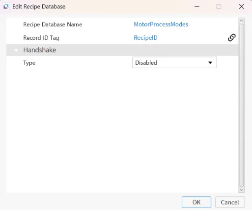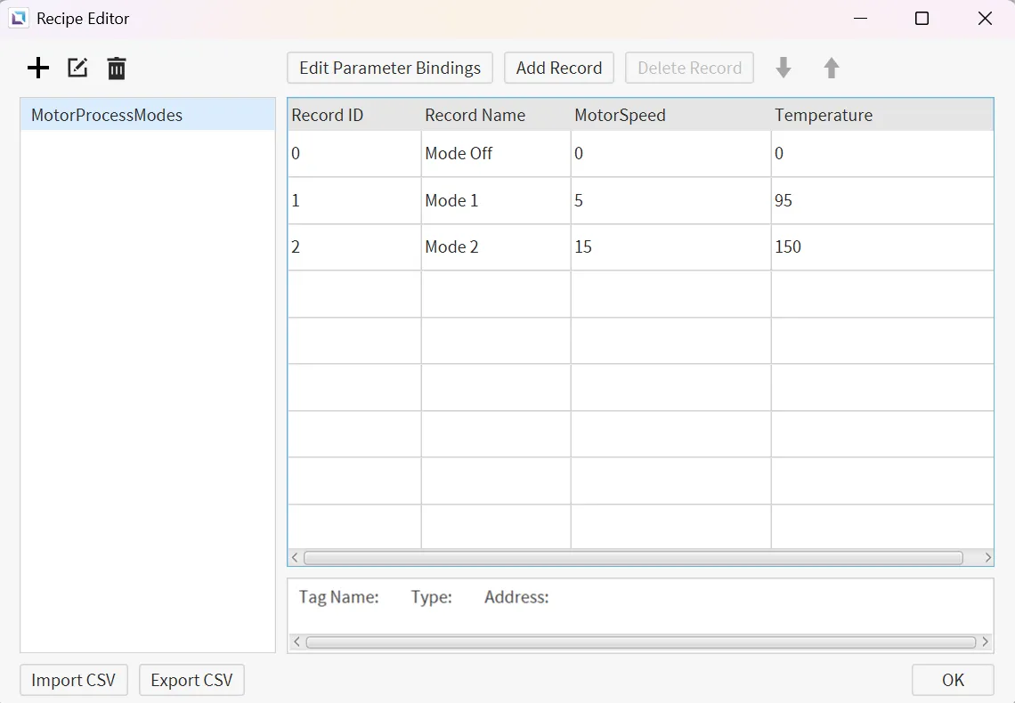 tag.write("MotorSpeed", recipe.getParameter("MotorProcessModes", tag.read("RecipeID"), 0));tag.write("Temperature", recipe.getParameter("MotorProcessModes", tag.read("RecipeID"), 1));