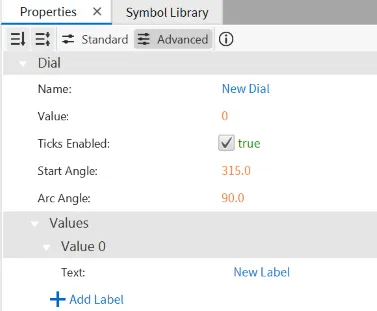 Section titled “Basic Properties”The Basic Properties section allows users to configure the object's Name, set its initial Value, toggle whether Ticks Enabled are visible, define the dial's Start Angle and Arc Angle, and manage the available Values (index) and their corresponding text labels.