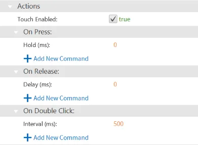 Section titled “Actions”The Actions section controls the interactive behavior of the Dial object. When the object is pressed, released, or double-clicked, a script or command is executed, and this specific behavior is configured under the On Press, On Release, or On Double click sections of the Actions tab.