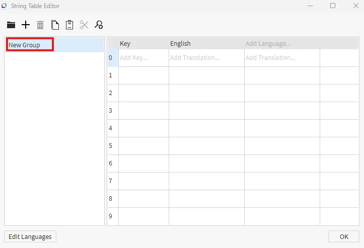 Section titled “String Table Configuration”- Open the String Table Editor. Change the name of the group from "New Group" to "Test" and copy the table provided in the screenshot.