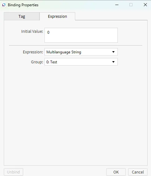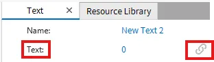Section titled “Project Configuration 3”- Next, select one of the text displays that we labeled "0-4" on the far right pane, where it shows text. Hover over that, and a chain link should appear. Click the chain link and select the tab that says Expressions. The initial value should already correspond to the correct Key ID within the String Table Editor. Set each of the displays (0-4) as follows, and confirm the initial value matches their number in the screenshot below.