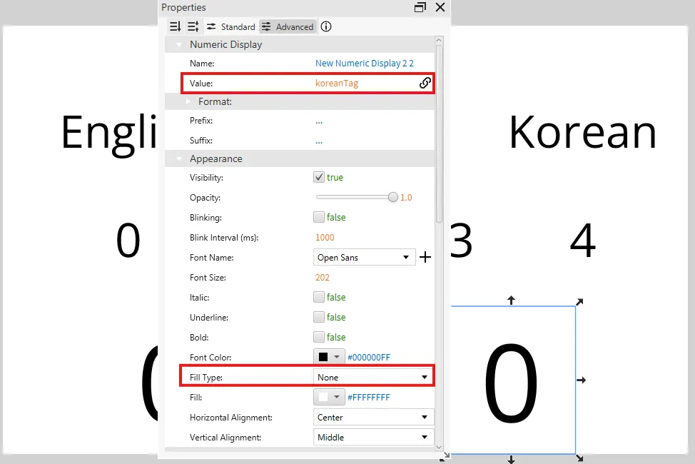 Section titled “Project Configuration 4”- Tag each of the three numeric displays with one of the language tags we created earlier. One display will receive the englishTag, another with the spanishTag, and the last with the koreanTag. Change the fill type to none under appearances on all of the displays. Lastly put all the displays on top of each other.