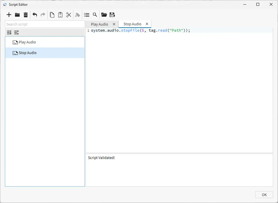 Section titled “Script Configuration”- Create the following scripts: 3. Play Audio - Running type: Manual 4. Stop Audio - Running type: Manual