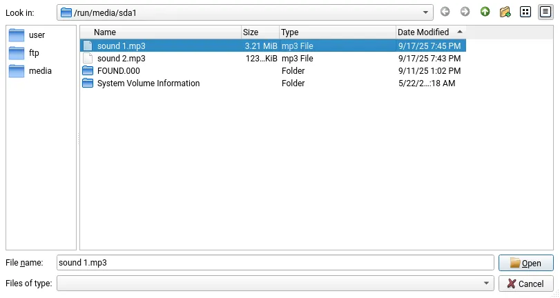 - Initial value: /run/media/sda1/sound 1.mp3
