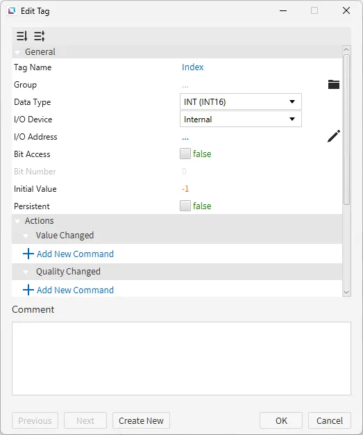 Section titled “Tag Configuration”- Create the following tags: 1 Fill Amount - Data type: INT (INT16) - Initial value: 0 2. Index - Data type: INT (INT16) - Initial value: -1