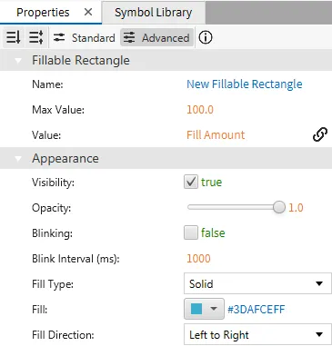 - This example also utilizes the Fillable Rectangle. Create a new Fillable Rectangle. Set the fill direction property to left to right. Bind the Fill Amount tag to the value property.