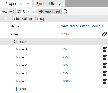 - For the radio button group object, bind the Index tag to the index property. Add five choices: "0%", "25%", "50%", "75%", and "100%". These correspond to the fill amount.