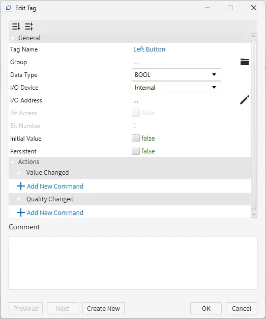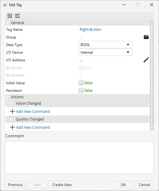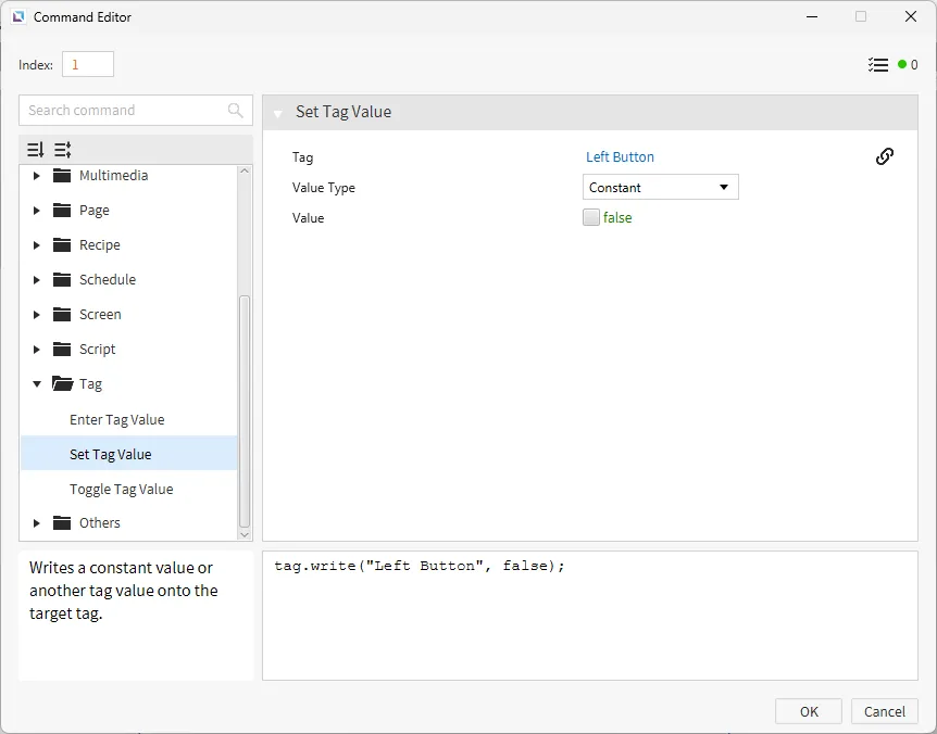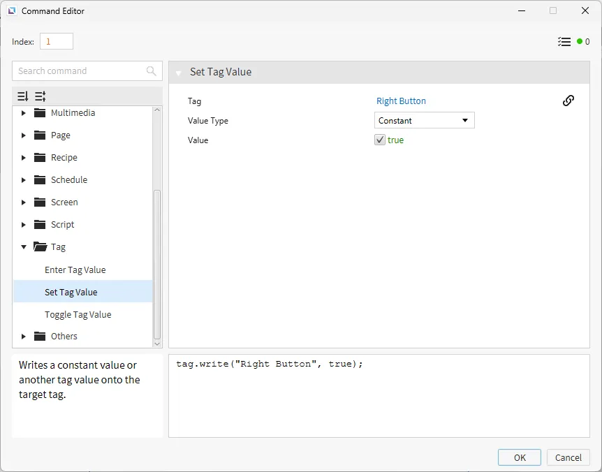 while (1) { if (tag.read("Right Button")){ tag.write("SparkLine", tag.read("SparkLine") + 1); } thread.msleep(50)}- Paste the following code into the Left Button script: