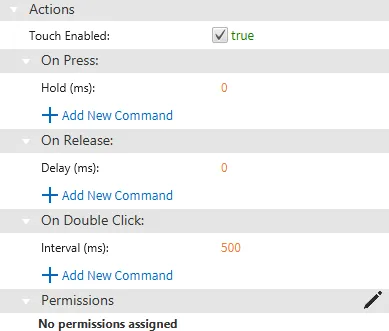 Section titled “Adding Permissions”Objects with actions available can have permissions set onto the object. To select a permission, go to the Actions properties on any object. Click on the Change Permissions icon to add a permission to the object. Once the permission is added, any users without the correct permission will no longer be able to interact with the object.