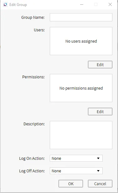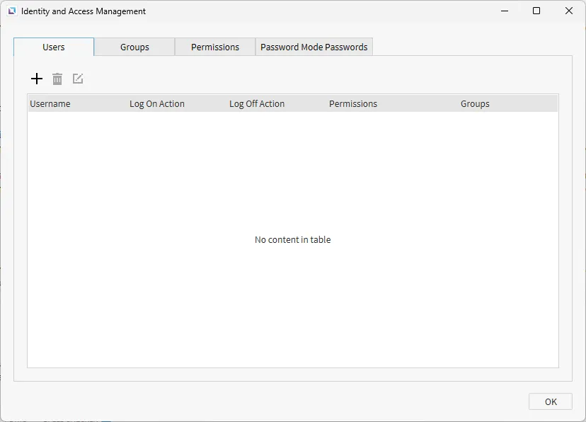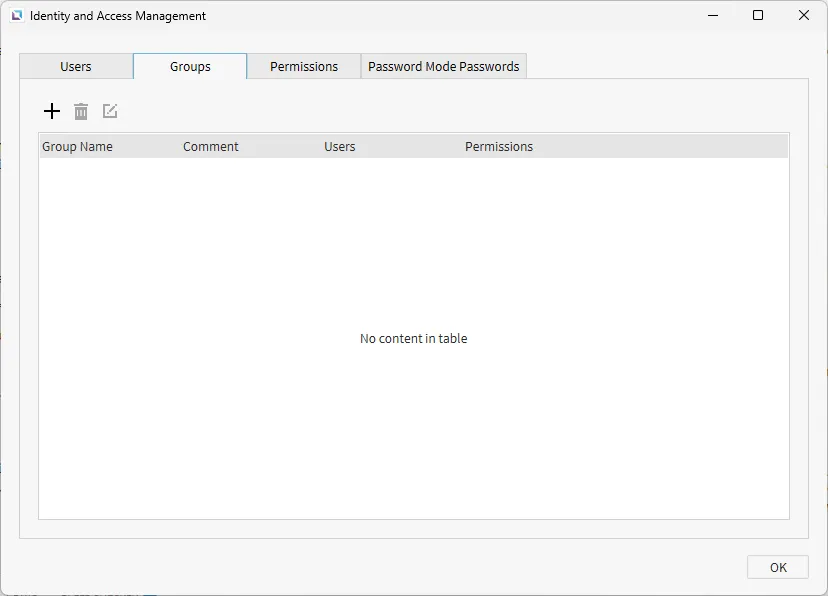Section titled “Groups”Groups are used to organize users under an umbrella to give permissions to multiple users at one time. To create a group, click the Group tab in the Identity and Access Manager window. Once on the Group tab, click the +, or Add Group, icon to create a group. Multiple users and permissions can be placed under the newly created group.