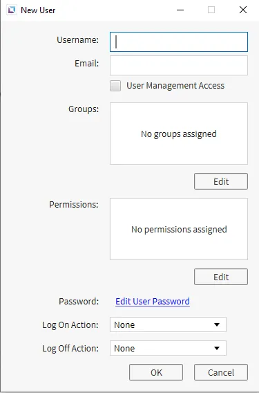 Users can be set up to allow specific permissions and actions when a user is logged in or out. In the Users tab, click the +, or Add User, icon and add any configurations needed to create the user. Once done, click OK, and the user will be made. Once created, users can be logged into and interact with anything they have permission to interact with. Users will be able to have an email set up to have notifications sent to the email provided.