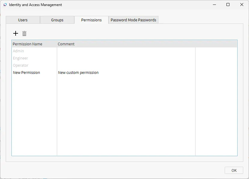 Section titled “Permissions”Permissions give users access to specific functionalities and prevent unauthorized access to particular portions of the program. To create a permission, first go to the Permissions tab. Once in the Permissions tab, click the +, or Add Permission, icon to make a new permission. A description can be added by double-clicking the description field and typing the description.