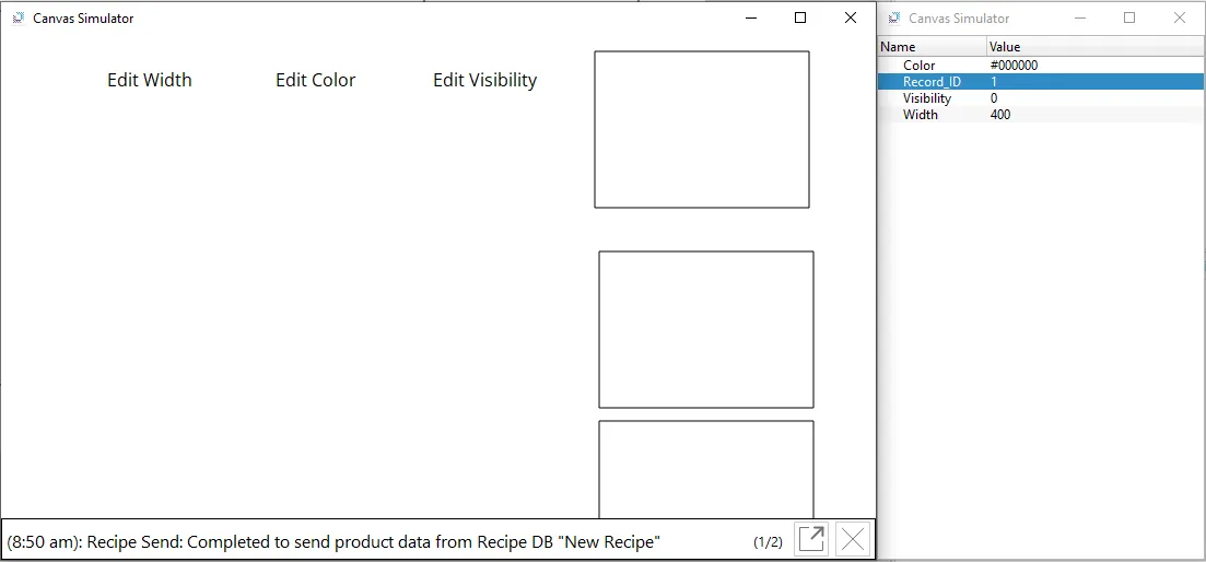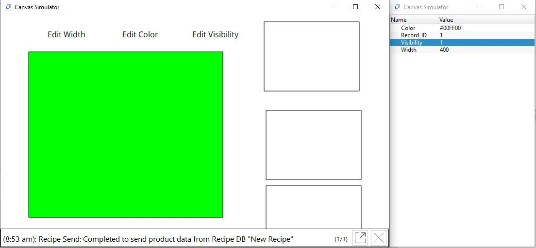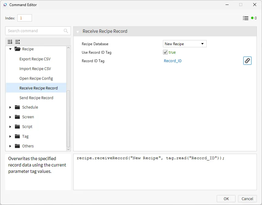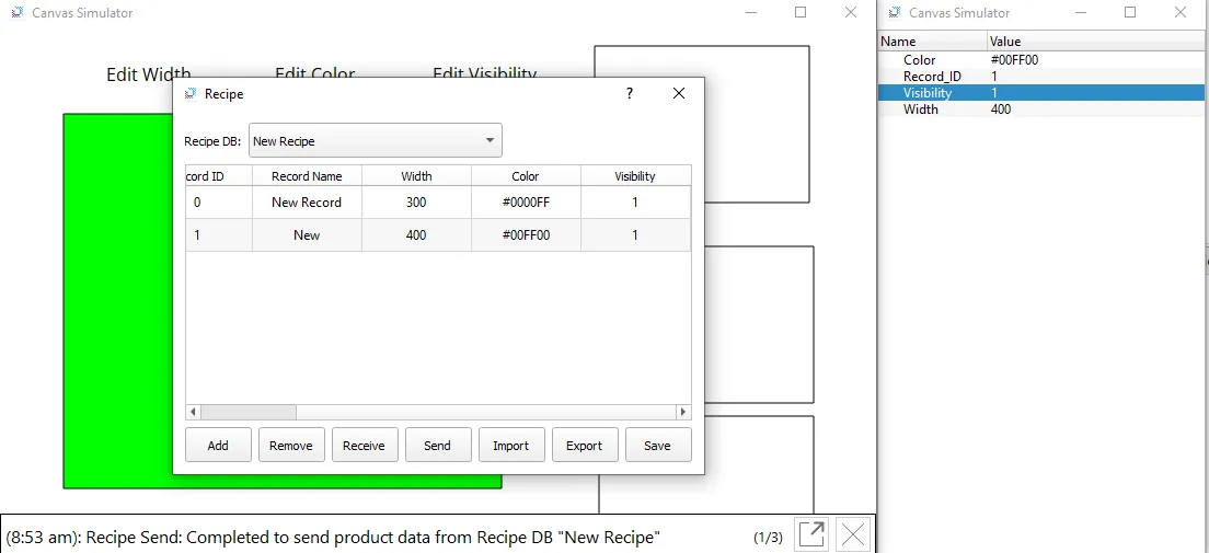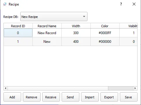 By clicking on the middle rectangle, the current tag values are recorded and saved within the Recipe at Record_ID 1.