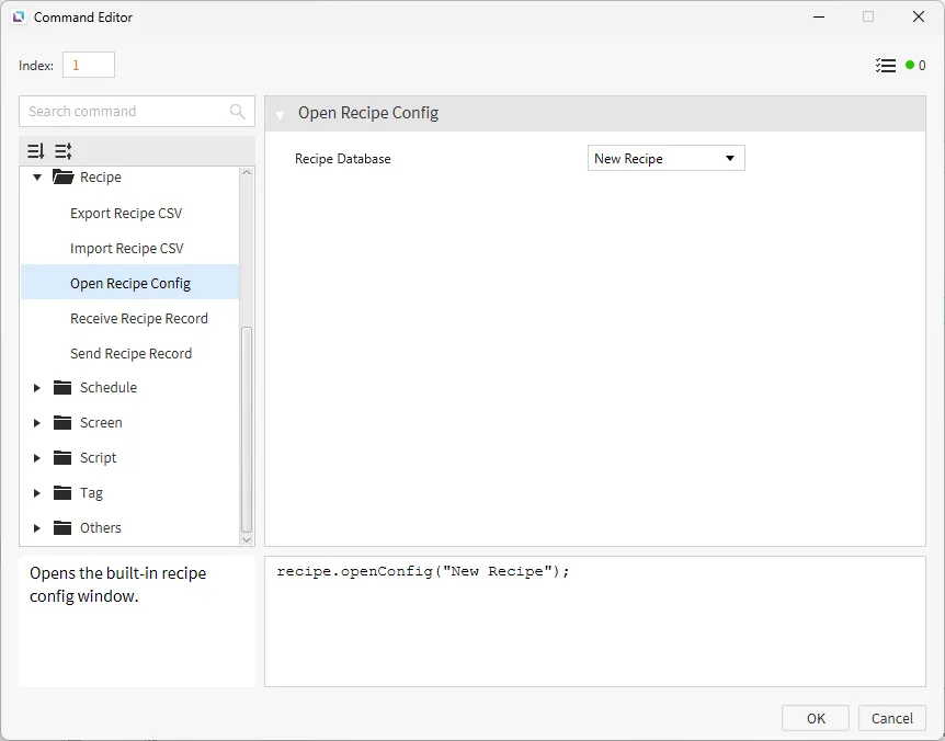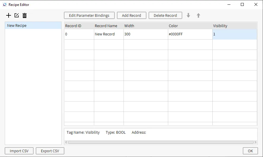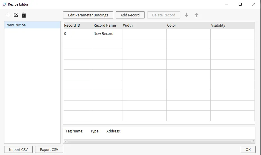 Section titled “Recipe Configuration”- Go to Tools > Recipe Editor or click on Open Recipe Editor icon within the toolbar. Create the following recipe database: