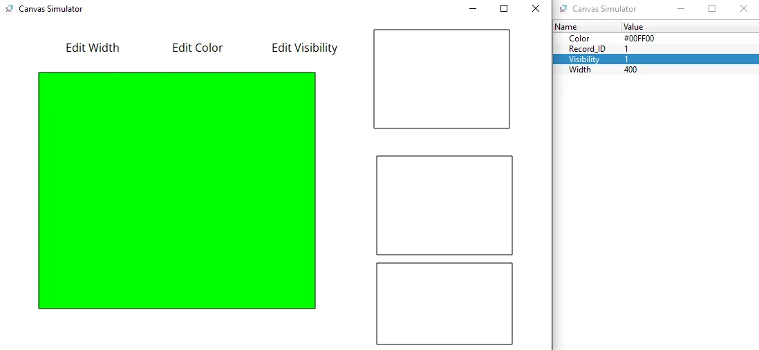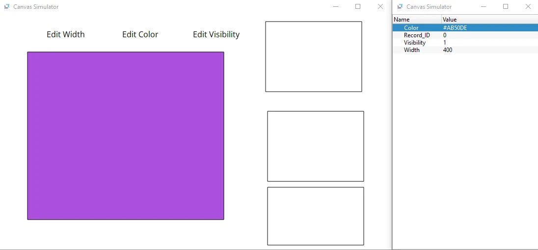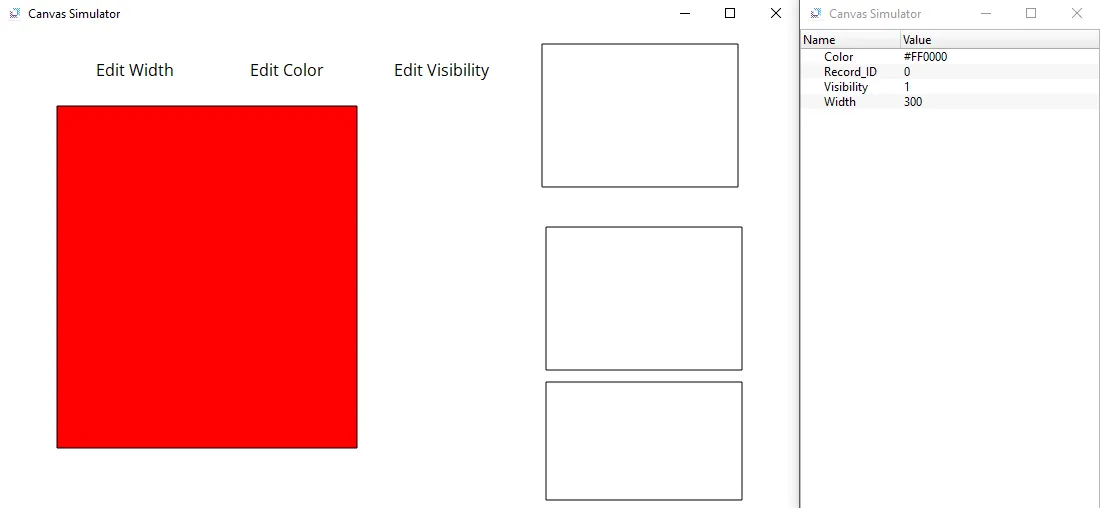 - Click the bottom rectangle, and click Add. Insert the following values: Record ID will be 1, Record Name will be "New", Width will be 400, Color will be #000000, and Visibility will be 0. After the following info has been added, click Save.