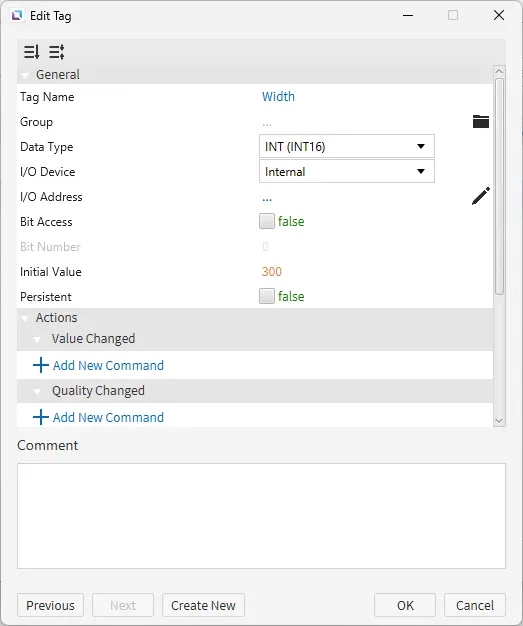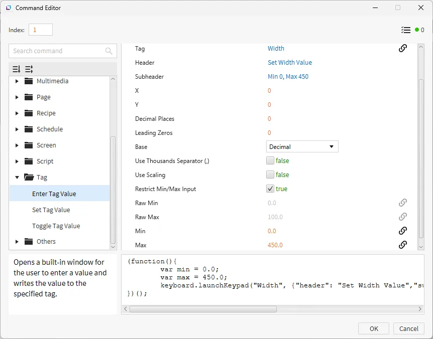 Click on the “Edit Width” text display and click the Actions property. Create a new On Press command. Select Enter Tag Value and bind the Width tag. The Header will say “Set Width Value” with the Subheader “Min 0, Max 450”. Enable Restrict Min/Max Input and set the Min to 0 and the Max to 450.