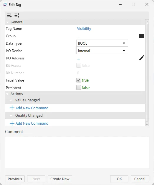 Finally, click on "Edit Visibility", then click on the Actions property. Create a new On Press command. Select Toggle Tag Value and bind the Visibility tag.