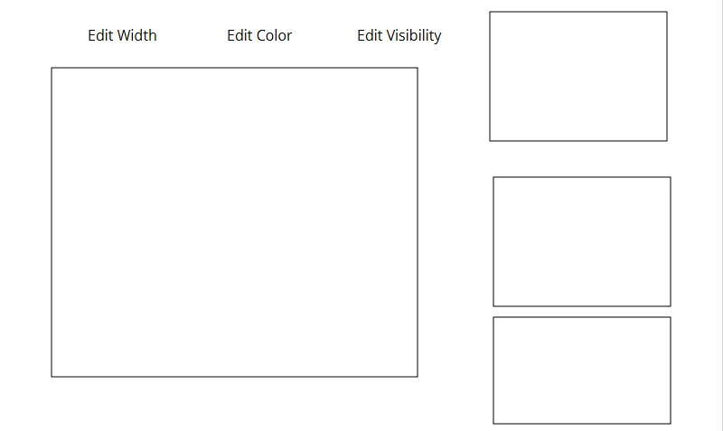 Section titled “Project Configuration”- Create three text displays and four rectangles. Three of the rectangles should be placed on the right side of the screen, while the last one will take up most of the left and middle of the screen. The three text displays will be placed above the final rectangle. The text displays will have the following text: “Edit Width”, “Edit Color”, and “Edit Visibility”.