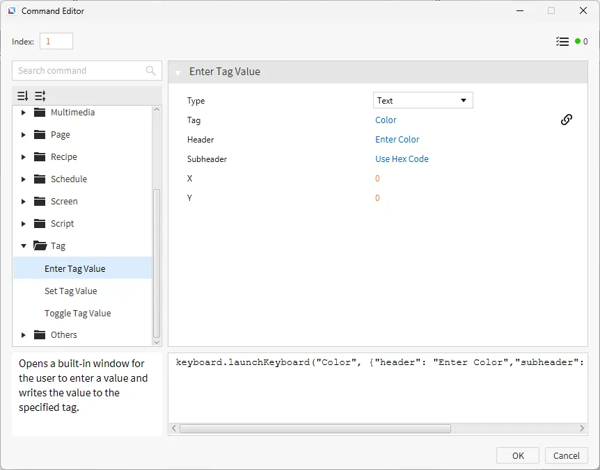Select the "Edit Color" text display, click on the Actions property, and create a new On Press command. Select Enter Tag Value and bind the Color tag with the type set to text. The Header will say “Enter Color” with a Subheader of “Use Hex Code.”
