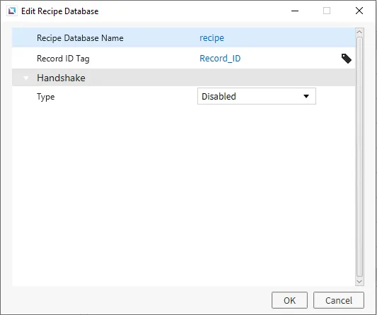 Section titled “Add / Edit Recipe Database”Clicking the + icon on the Recipe Editor, or Edit Recipe, will open a pop-up window to create a new Recipe Database. Here, users can set the recipe's name and the tag to which the record ID will be stored. The record ID allows users to navigate different records within the recipe easily. Users also have the option to enable handshake.