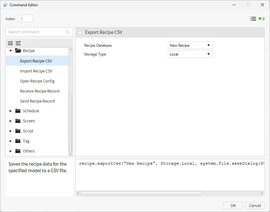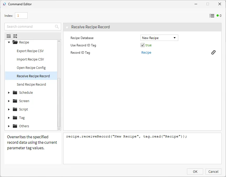 Section titled “Recipe Feature Description”Recipes are a way to save preset parameters for tag values and can be changed to presets during runtime. Users can create new Recipes with a similar or completely different preset. Recipes make it much easier to change multiple tag values simultaneously. Sending a recipe record will write the recipe parameter values to the specified tags. Receiving a recipe record will save the recipe's current tag values and allow those same values to be called back during runtime.