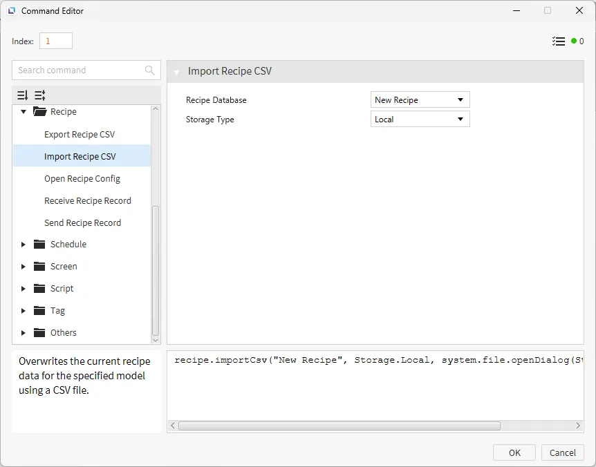 A CSV file can be imported in two ways: creating a command set to Import Recipe CSV or creating a script that calls the following function: recipe.importCsv(String recipe, Storage type, String path). The user can specify the recipe database, storage location, and a path to the CSV.