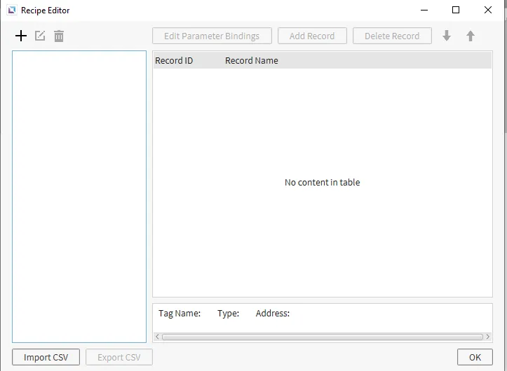 Section titled “Recipe Editor”The Recipe Editor is where users can create, edit, and delete recipes. Users can also import and export CSV files to bring pre-existing recipes into the project. Users can also edit the parameter bindings, add and delete records within the recipe, and edit the parameter values for each record.