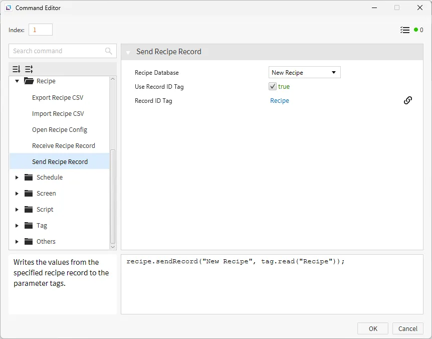 Section titled “Receive and Send”Recipes can receive and send data to tags with commands. Recipes have action commands that allow users to interact with the recipe list during runtime. Sending a recipe record will set the tag values to whatever values are saved within that record. Receiving a recipe record will store the current tag values within the recipe, which can be sent again later within the runtime.