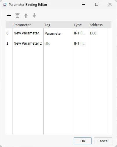 Section titled “Parameter Bindings”Parameter bindings bind a tag to each specific parameter. This allows users to specify which tags will be updated when a recipe is received. Users can create, delete, edit and set tags for each parameter. The order of parameters can also be changed.