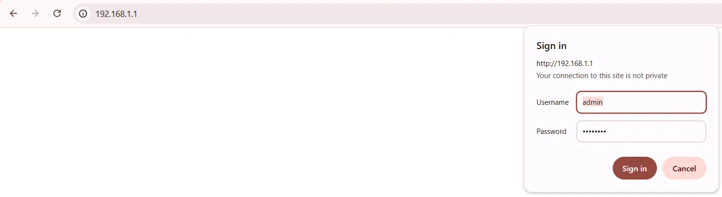 Section titled “Port Forwarding”- Log into your router. Enter your router’s internal IP (192.168.1.1, for example) into your web browser. Log in using your admin credentials.