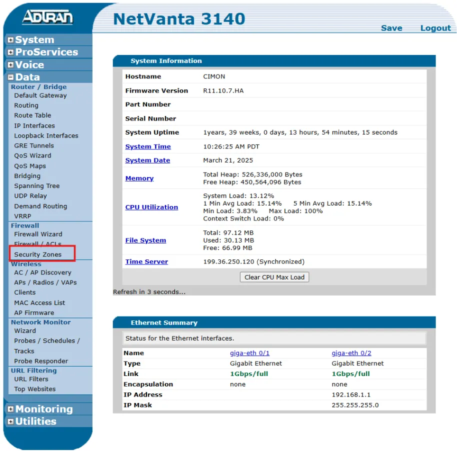 - Navigate to Security Zones. On the router's homepage, click on: Data > Router / Bridge > Firewall > Security Zones.