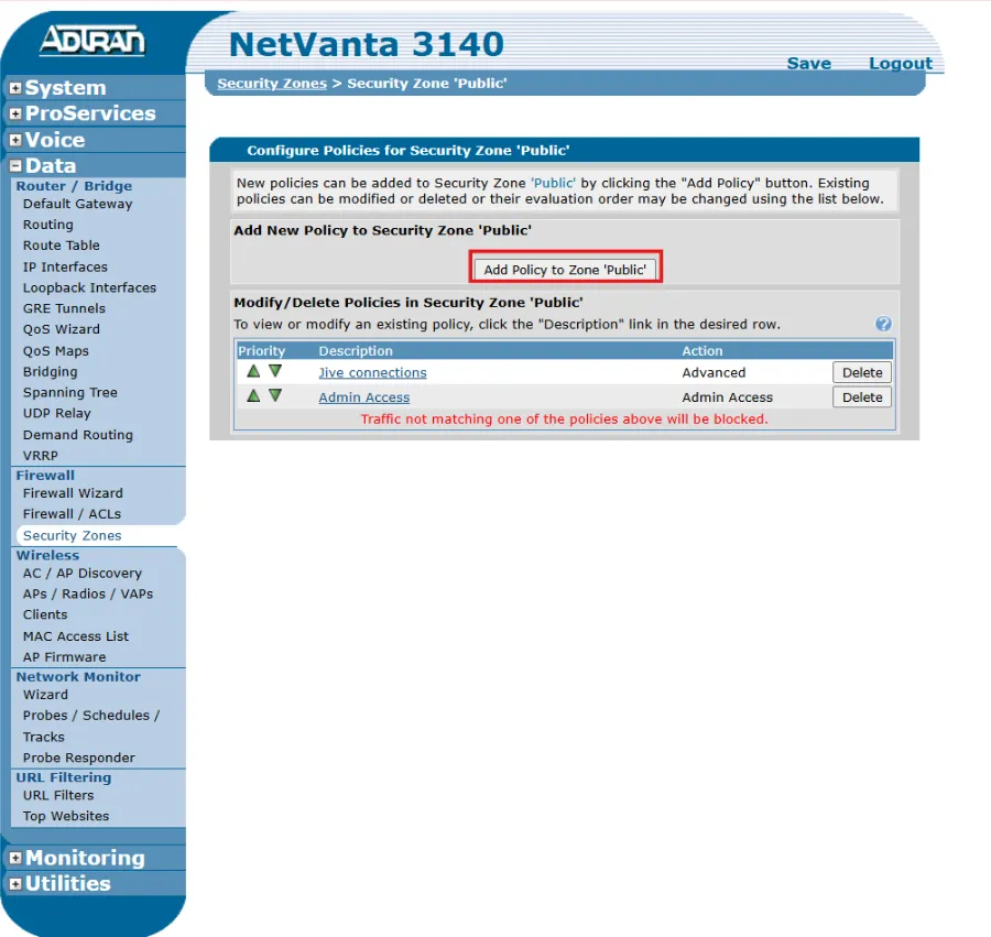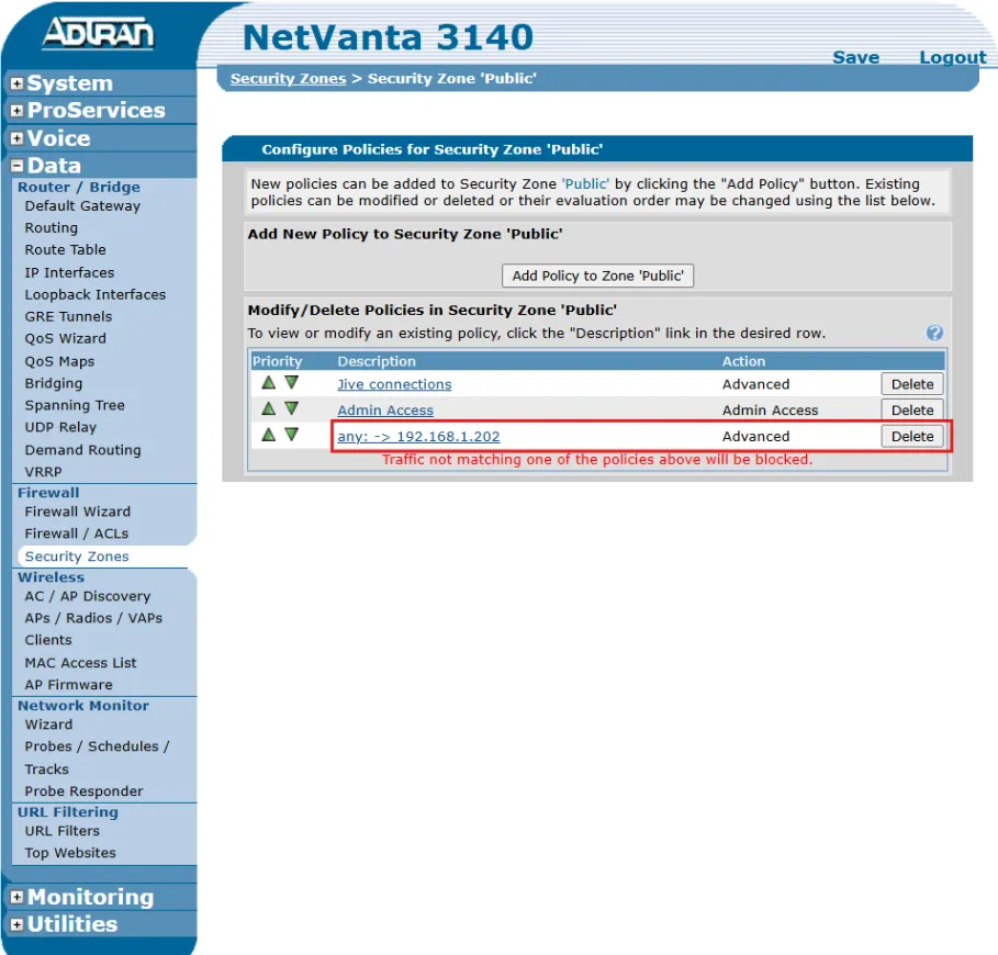 - After applying settings, confirm your policy appears under the Modify/Delete Policies in Security Zone 'Public' section.