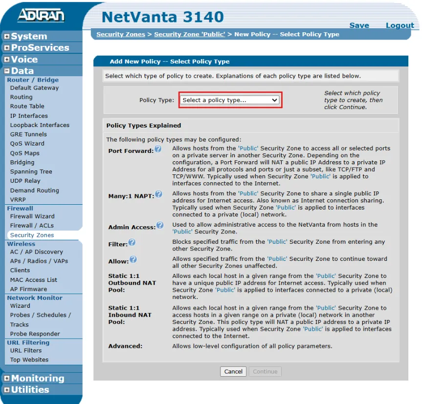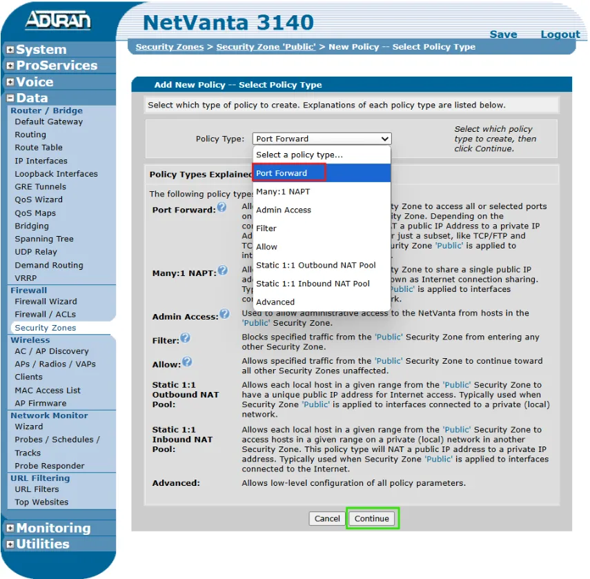 - Under the Policy Type drop-down menu, select Port Forward and click Continue.