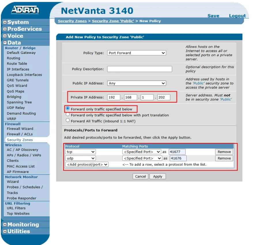 Section titled “Connecting to Xpanel on External Network”This is a guide on setting up port forwarding for TCP and UDP. The goal is to use TCP and UDP on an ADTRAN NetVanta 3140 router to remotely access an Xpanel from an external network.