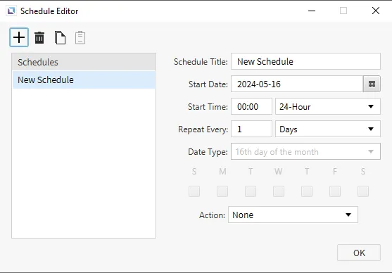 Section titled “Schedule Editor”To open the Schedule Editor, click Tools > Schedule Editor or the Open Schedule Editor icon on the toolbar. The window will allow users to set schedules for when an action should occur. Users can select the start date, time, repetition period, and date type. Users can also set the action to run when the schedule activates. A script or command can execute when scheduled to do so.