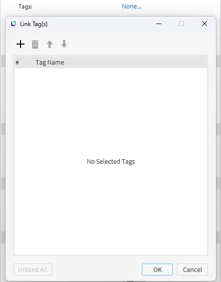 - Manual Binding: A tag or tag group can be manually assigned by clicking the chain link icon next to the Tag property or by dragging a tag group directly onto the Tag property field.