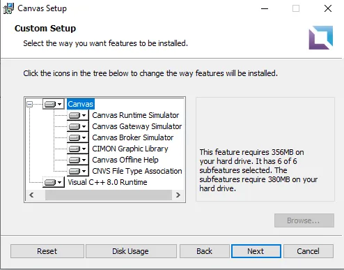 - The Canvas Setup Wizard will ask which parts of the installer to include. By default, all options will be selected for the optimal experience. Click Next after selections to continue the installation process.