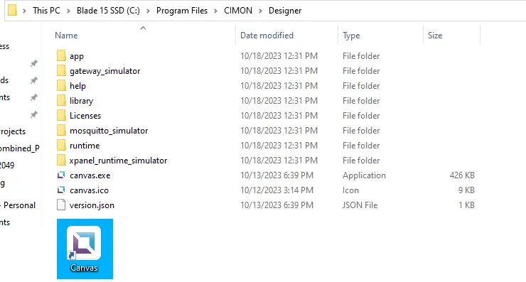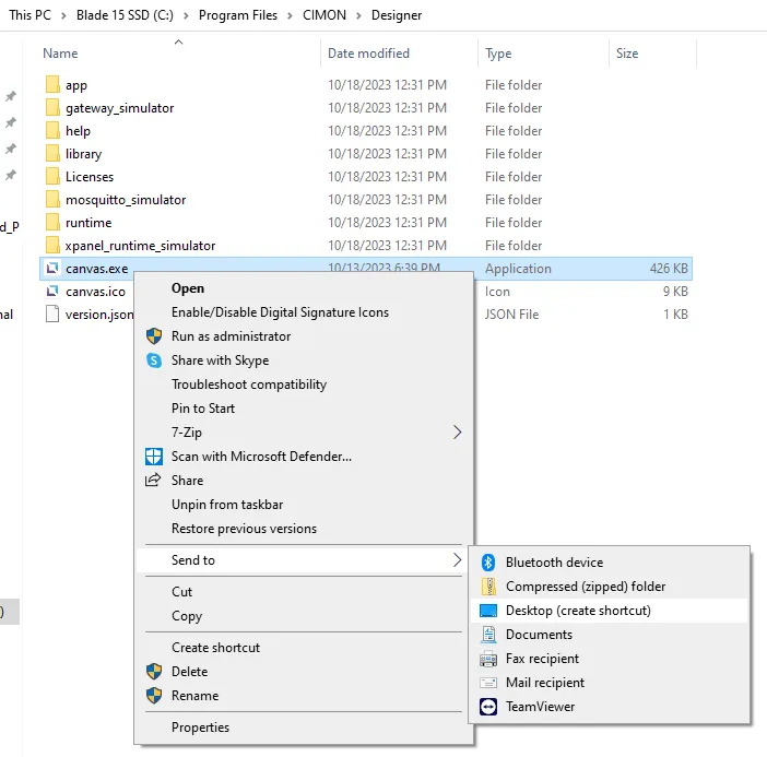 Go to the CIMON Canvas installation path. The default path is C:\Program Files\CIMON\Designer\. This path may differ based on the user's system environment. Select and right-click the Canvas.exe application > click Send to > Desktop (create shortcut). The shortcut icon for CIMON Canvas will then appear on the desktop.