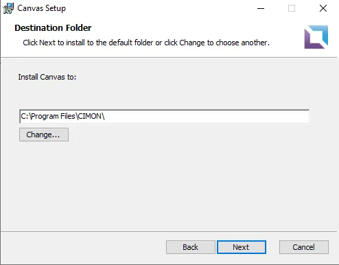 - Specify the location of CIMON Canvas and click Next. If the path is unchanged, the software will be installed to *C:\Program Files\CIMON* by default. However, the default pathway may differ depending on the version of CIMON Canvas.