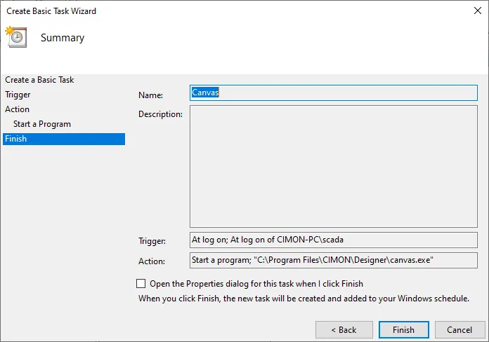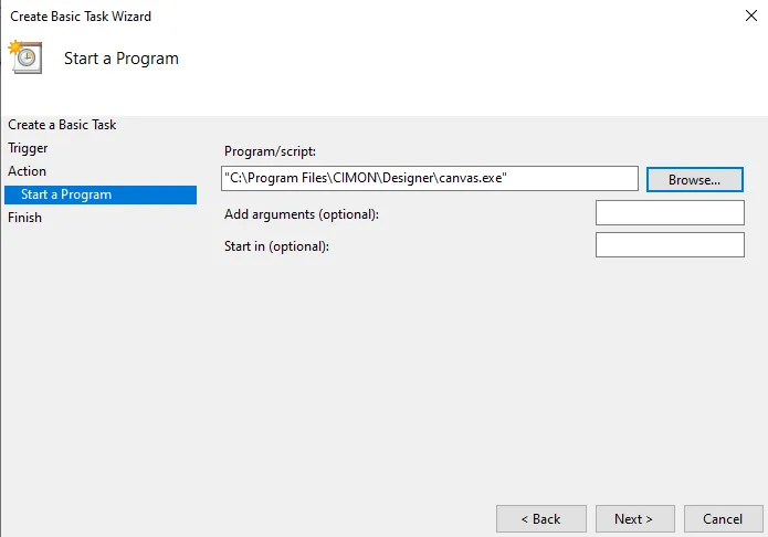 - On the Start a Program section, click Browse… > select the location of the “CIMON Canvas.exe”> click Next.