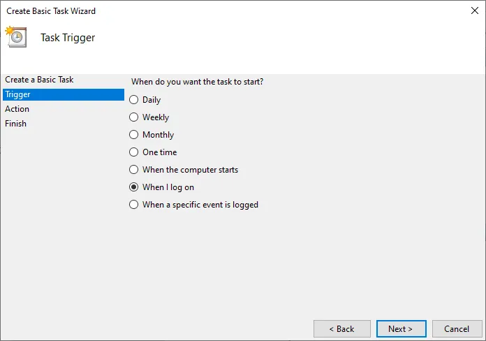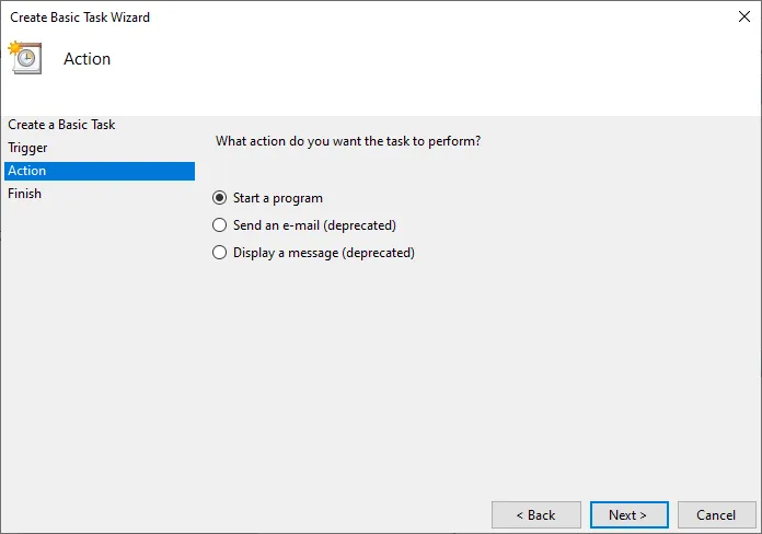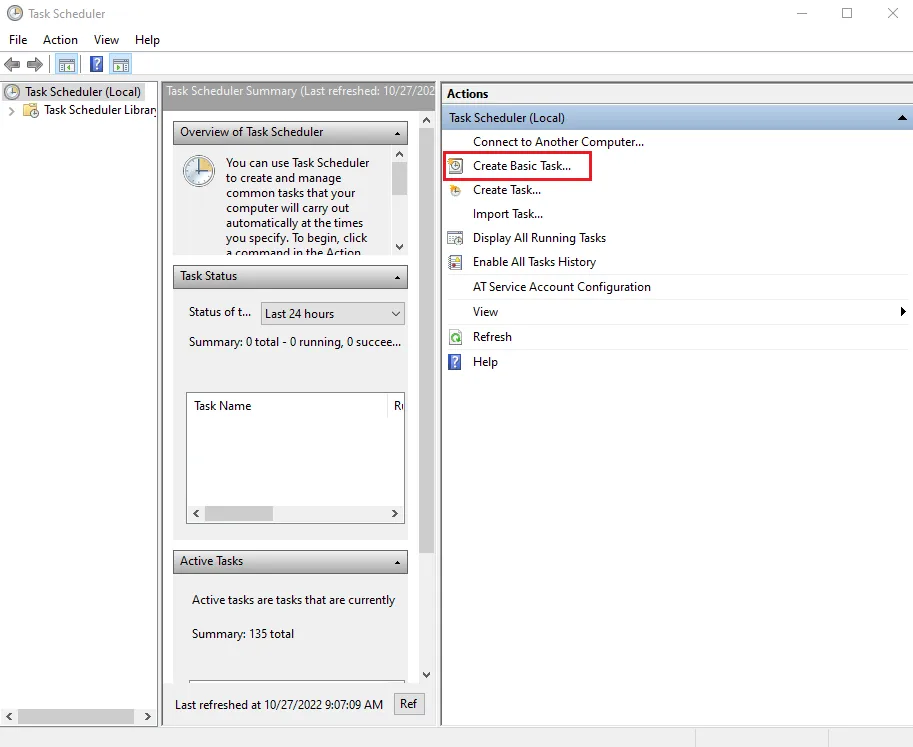 - Click Create Basic Task… on the upper right side of the Task Scheduler window to open the Create Basic Task Wizard window.