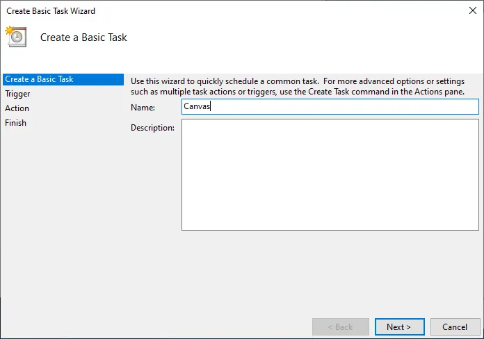 - On the Create Basic Task Wizard window in the Create a Basic Task section, type “Canvas” in the name field > click Next.
