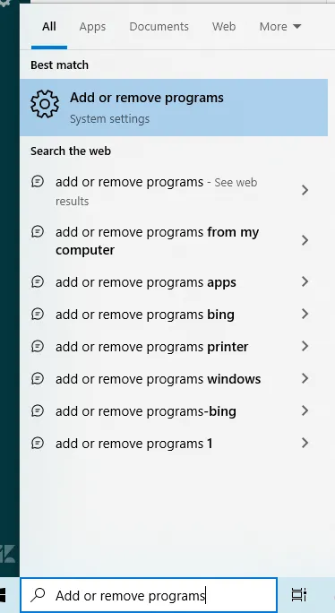 Section titled “Uninstallation”- Type "Add or remove programs" into the Windows Search bar and press enter.