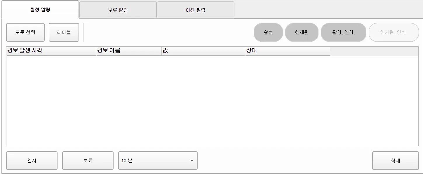 - 경보 이력(이전 알람) 탭으로 이동하여 그동안 발생했던 경보의 모든 이력을 확인할 수 있습니다.