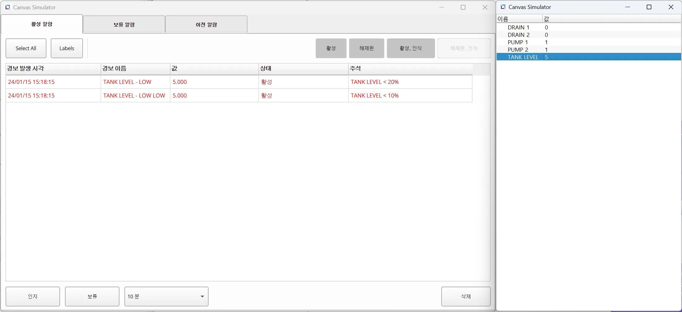 TANK LEVEL 태그 옆에 있는 50을 더블클릭하고 숫자 5를 입력합니다. TANK LEVEL - LOW와 TANK LEVEL - LOW LOW 두 알람이 모두 조건을 충족하므로 두 개의 알람이 발생하며, 해당 알람의 내용을 확인할 수 있습니다.