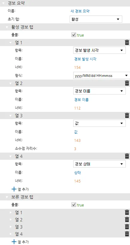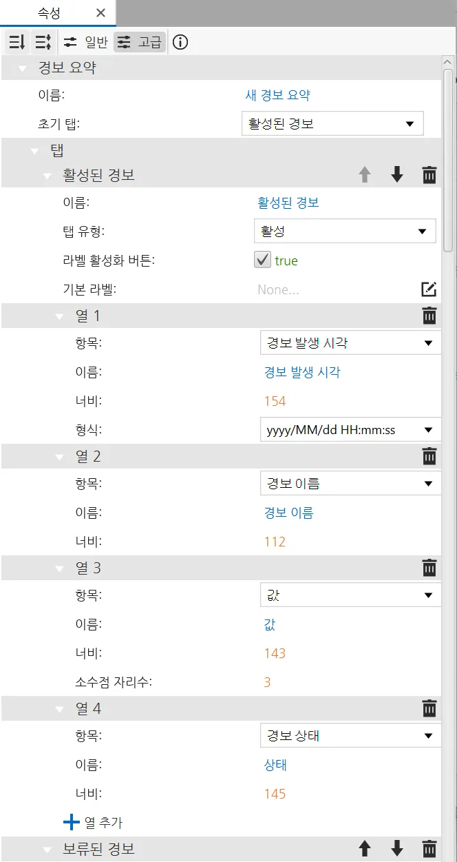 오브젝트의 기본 속성 탭에서 활성 경보 탭의 열 4 아래의 + 열 추가를 눌러 열 5를 추가합니다. 열 5는 설명으로 기본 설정됩니다.