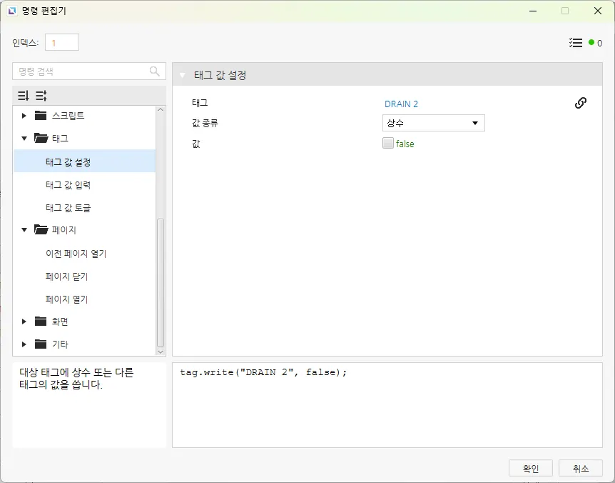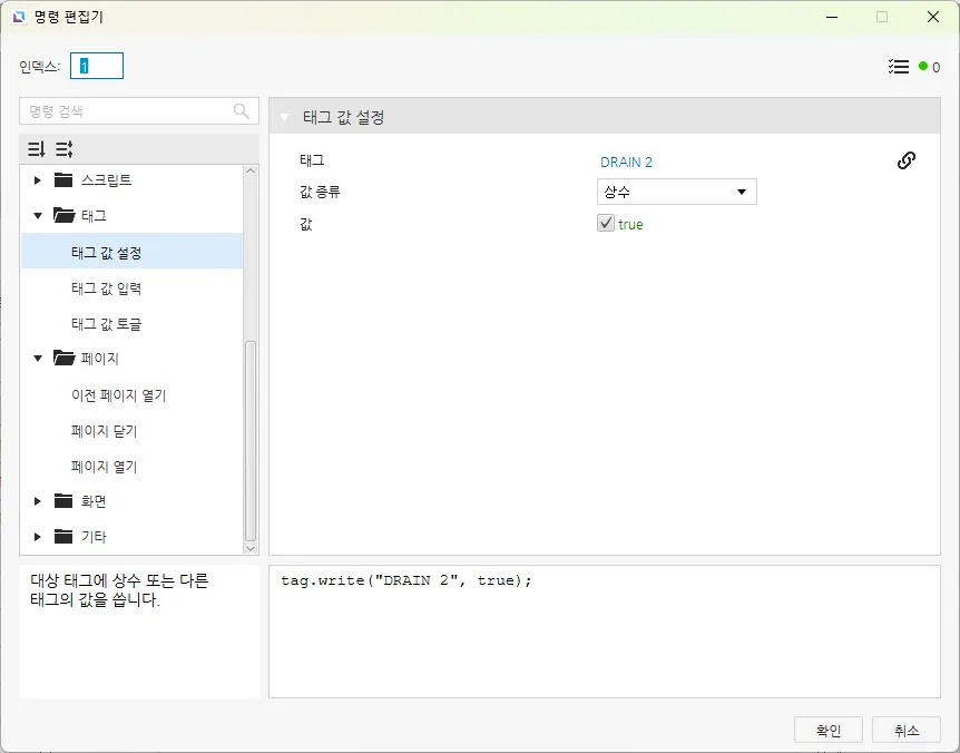 새 명령 추가를 선택합니다. Set Tag Value 명령을 사용하여 DRAIN 2 태그에 할당하세요. 설정할 값을 true로 지정하세요.