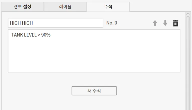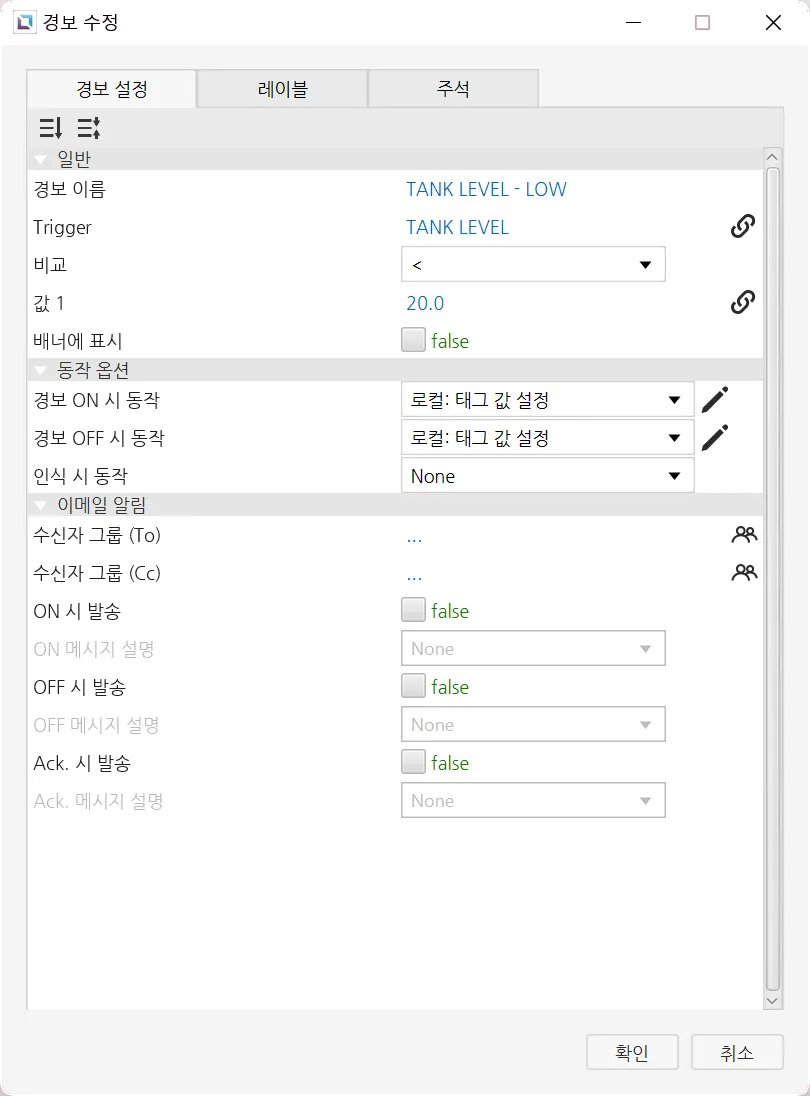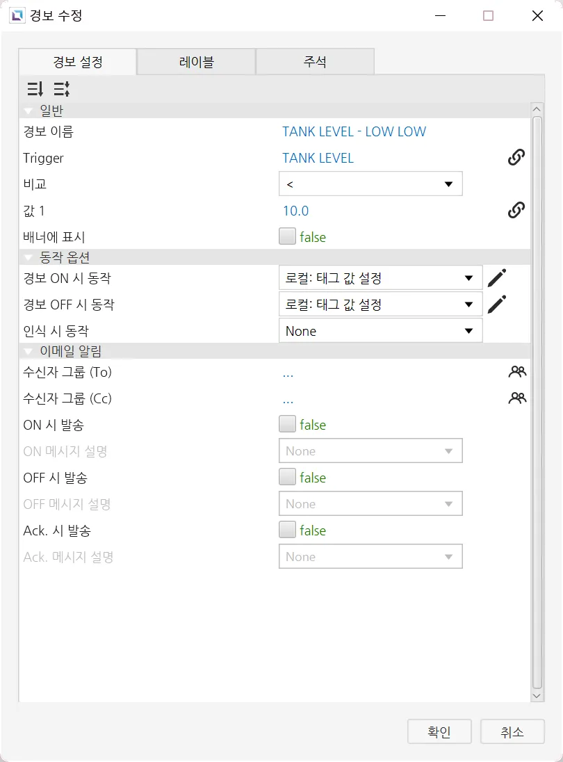 [도구] > **[경보 편집기]**를 통해 경보 설정을 시작합니다. TANK LEVEL 태그에 대해 다음 경보를 설정하세요.