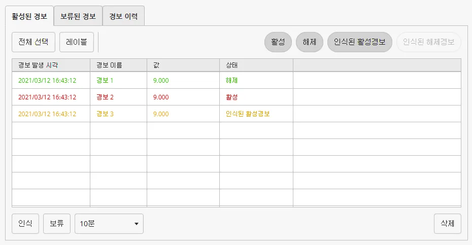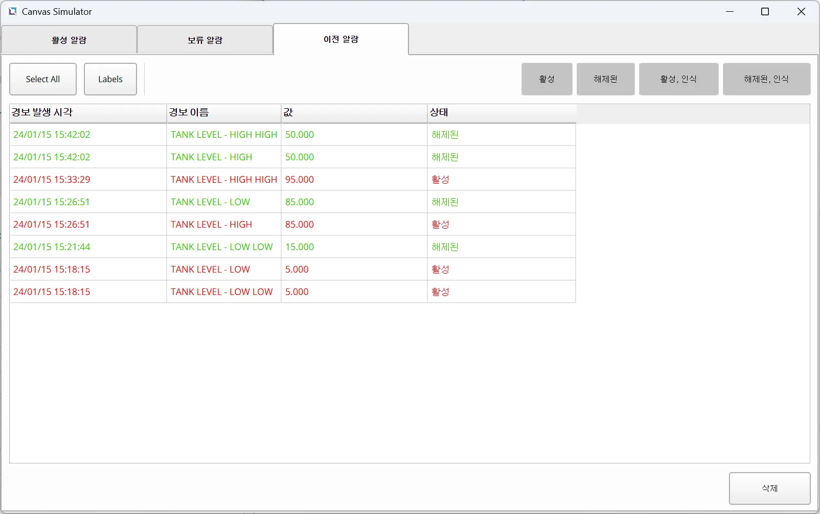 초록색 텍스트는 알람이 해제되었음을 의미합니다.